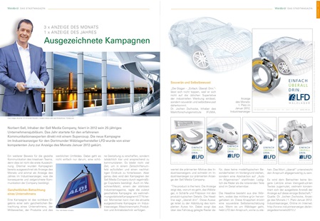 Das ist allerdings nicht die einzige Auszeichnung für die Werbespezialisten im Bereich Print und Film. Anzeige des Jahres beim IndustrieAnzeiger, dazu mehrfach Anzeige des Monats und bei Copytests seit Jahren unter den besten drei Anzeigen-Kampagnen, um nur einige Höhepunkte der letzten Jahre zu nennen.
